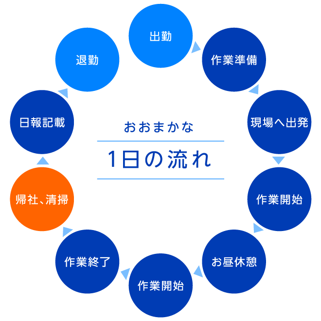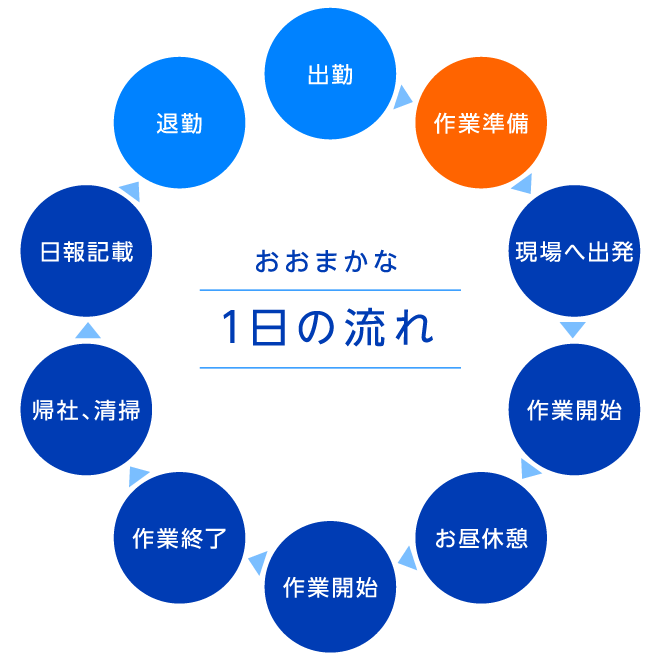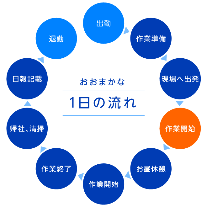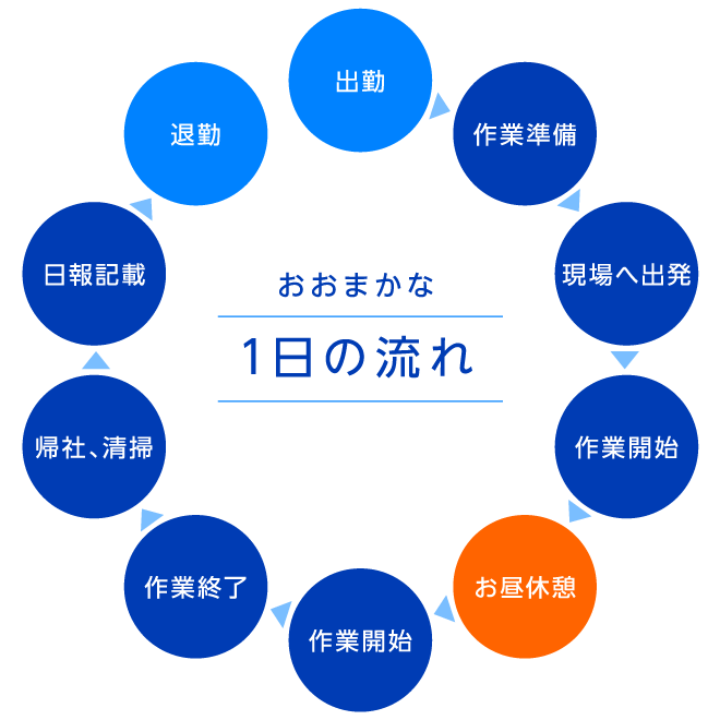 [メッセージ] 基本現場には、2人1組で作業します。毎日メンバーは変わるので先輩や後輩とのコミュニケーションも取れやすく、年齢や入社年次は関係なく、やる気のある方は、たくさん仕事を任せてもらえるので、とてもやりがいがある会社です。始めのうちは、覚える事多く、大変かと思いますが、何事にも興味を持って作業しているといつの間にか身に付いてくる物です。 これから、どんどん大きくなっていく会社だと思っています。一緒に盛り上げて大きくしていきましょう!!
