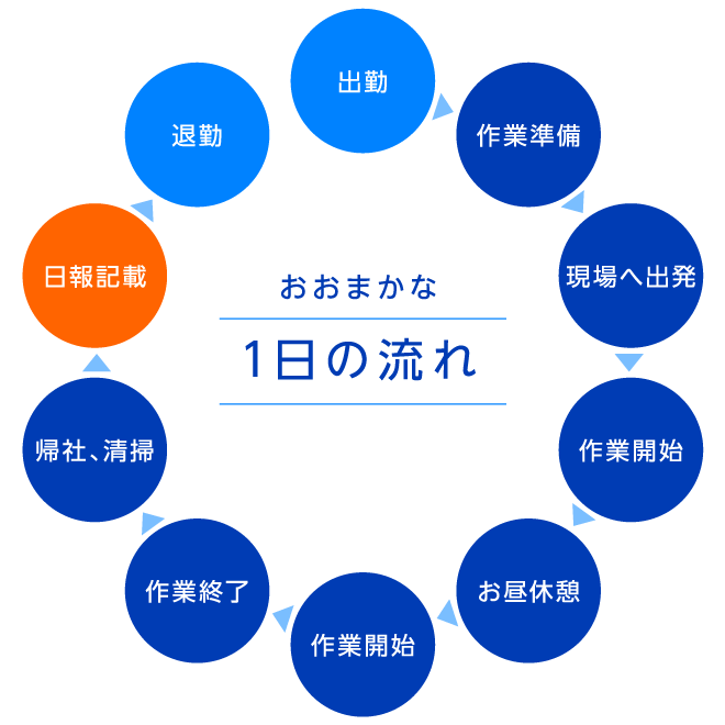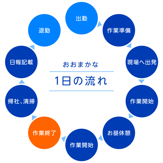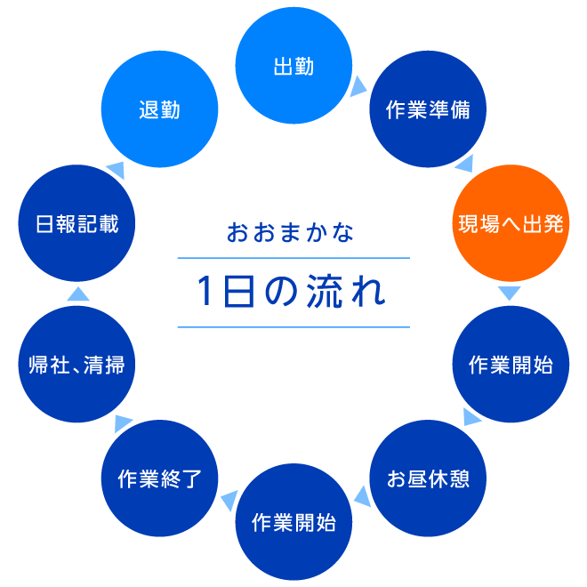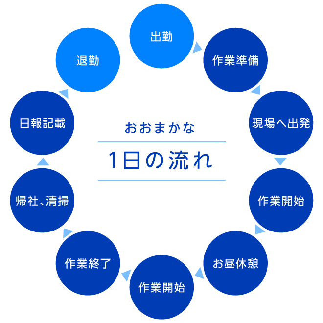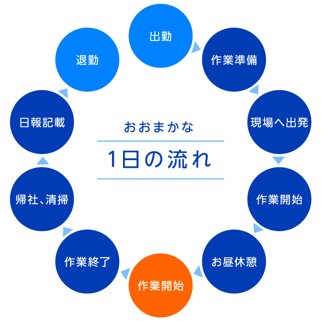 [メッセージ] 基本現場には、2人1組で作業します。毎日メンバーは変わるので先輩や後輩とのコミュニケーションも取れやすく、年齢や入社年次は関係なく、やる気のある方は、たくさん仕事を任せてもらえるので、とてもやりがいがある会社です。始めのうちは、覚える事多く、大変かと思いますが、何事にも興味を持って作業しているといつの間にか身に付いてくる物です。 これから、どんどん大きくなっていく会社だと思っています。一緒に盛り上げて大きくしていきましょう!!